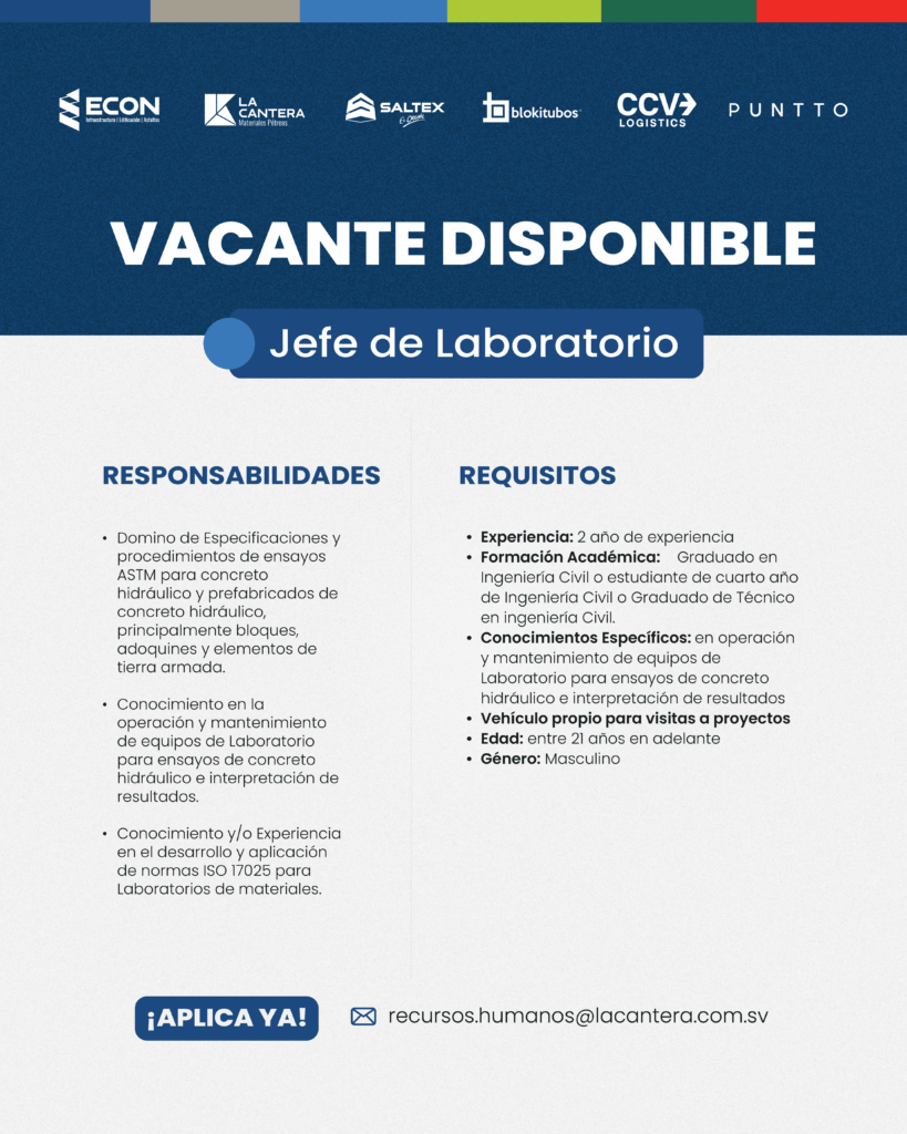 - Conocimiento en la operación y mantenimiento de equipos de Laboratorio para ensayos de concreto hidráulico e interpretación de resultados.